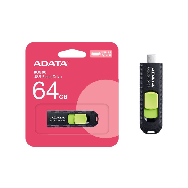 MEMORIA USB ADATA 64GB 3.2 RETRACTIL TIPO C NEGRO VERDE ACHO UC300 64GRBK GN