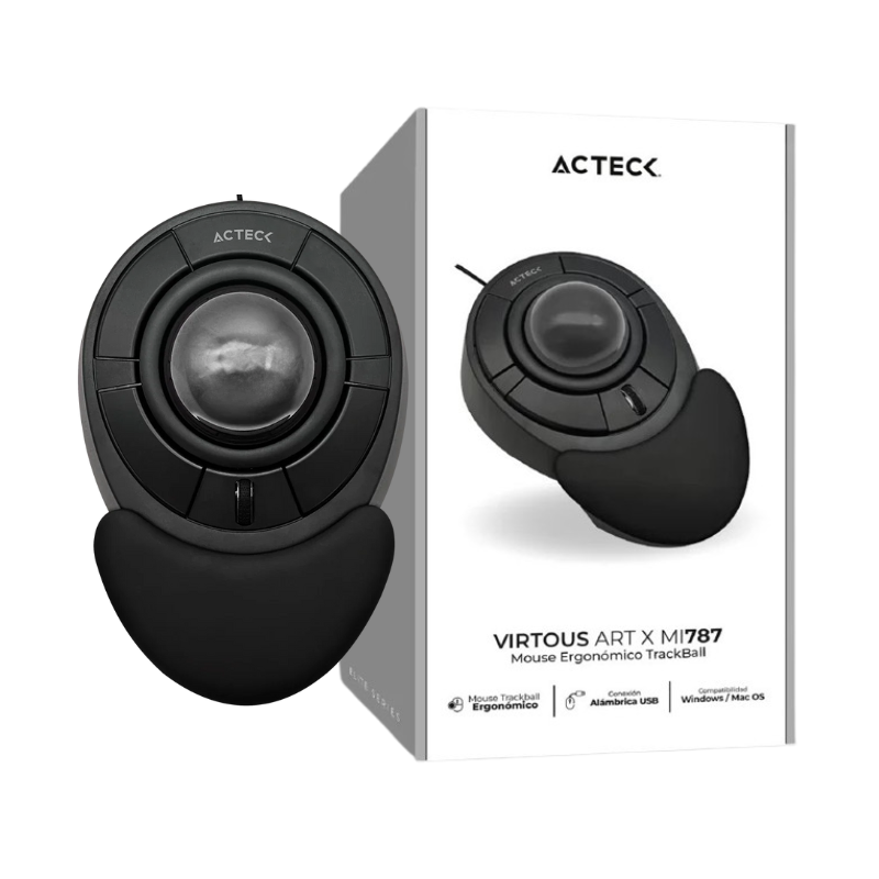 MOUSE ACTECK ERGONOMICO TRACKBALL VIRTUOS ART X MI787 ALAMBRICO RUEDA DE DESPLAZAMIENTO CENTRAL REPOSA MANOS DESMONTABLES BOTONES AVANCE Y RETROCESO CONEXION USB A ELITE COLOR NEGRO AC 939584